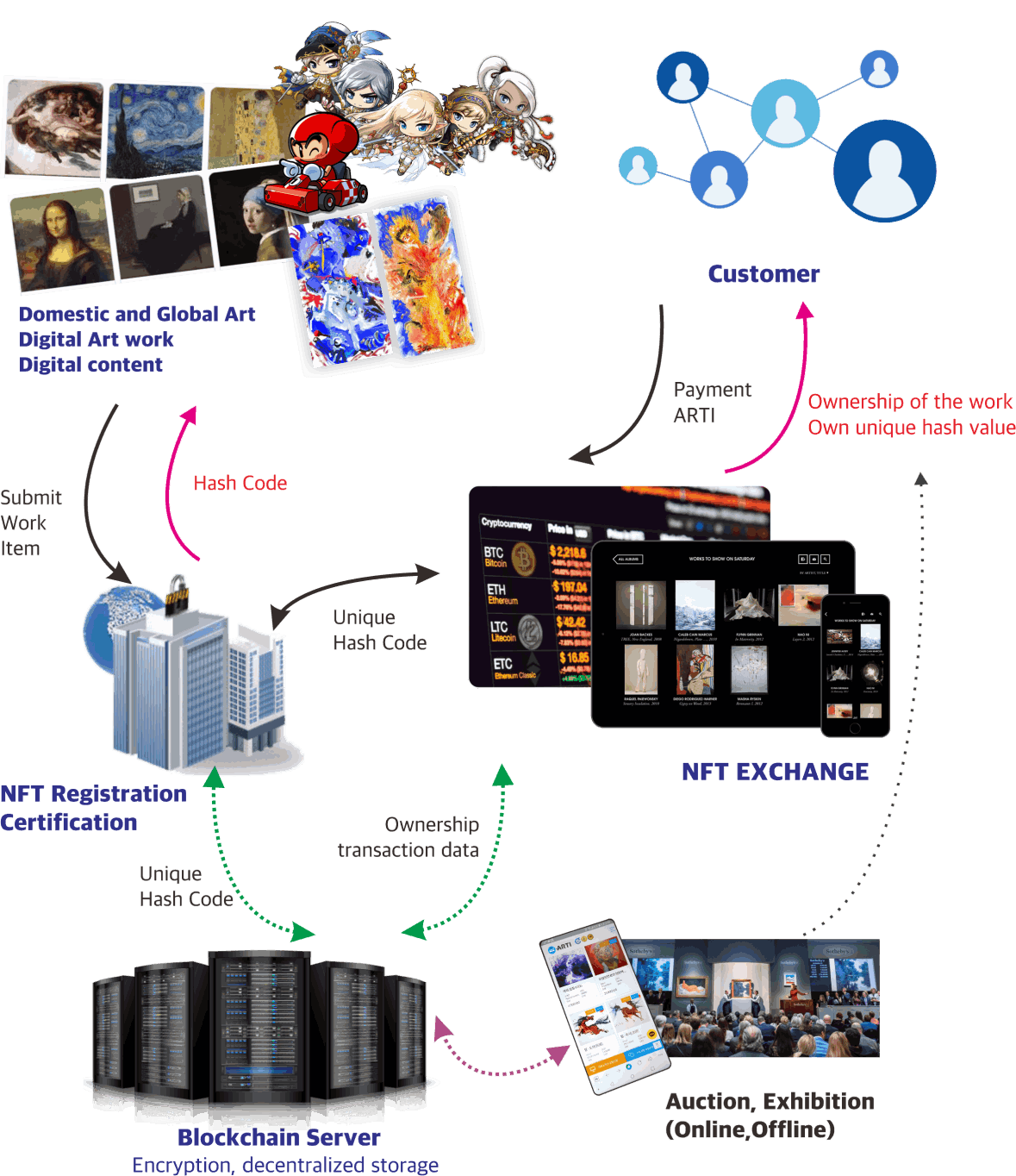 ARTi market place通过NFT认证机构和专家审议并认证作品真伪。可以事前防止NFT市场上没有经过验证的盲目性产品上传质量下降的问题。认证的艺术作品为防止所有权伪造,变造,采用NFT技术发行具有不可替代的哈希值的固有代币,不可替代的固有代币在区块链上登记保存。